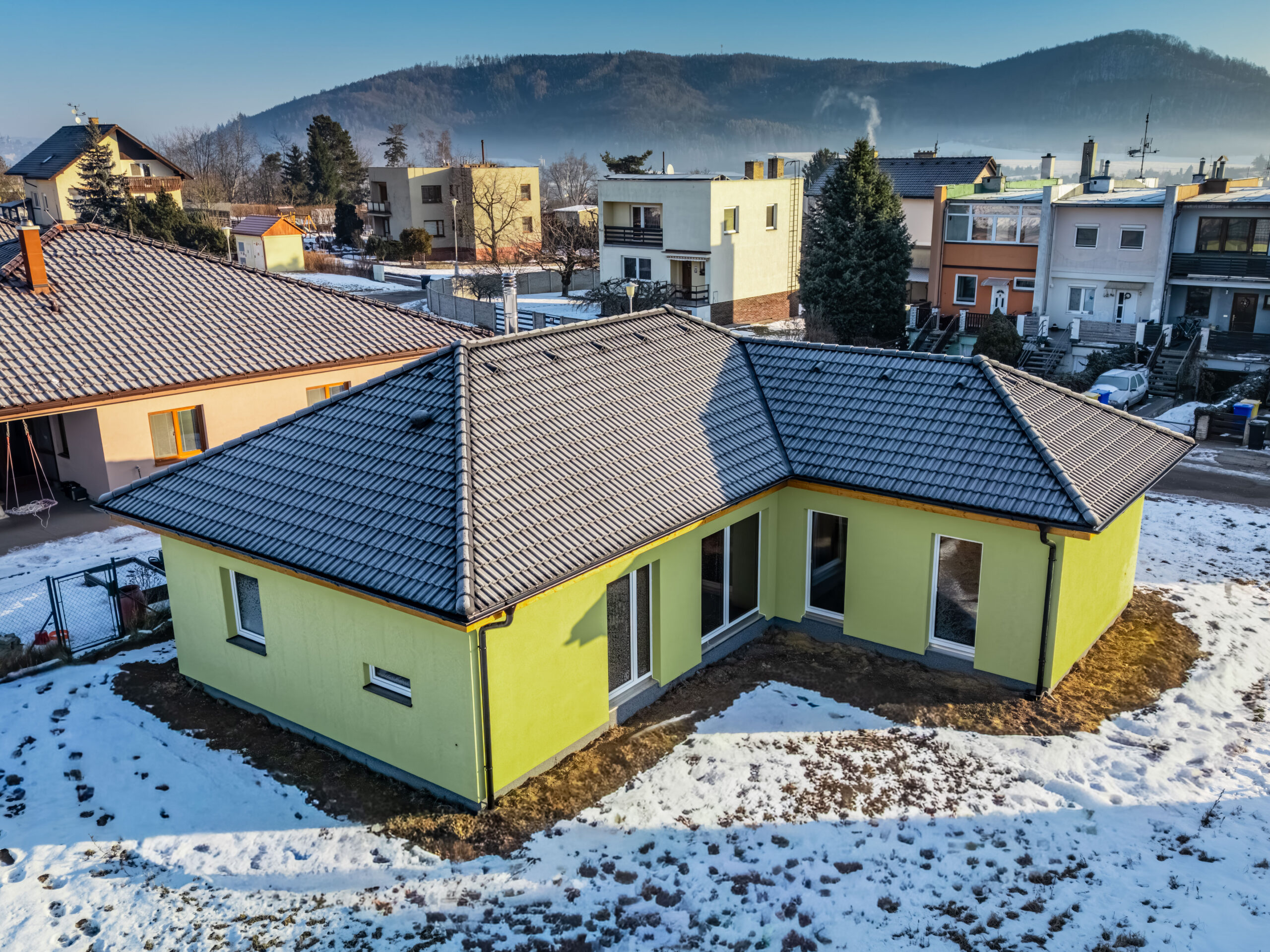 Nemovitost stojí na pozemku o rozloze 642 m², obklopená klidem a přírodou, přesto jen kousek od centra města. Každý den vám zpříjemní nádherný výhled na Hřebeč, který si můžete vychutnávat z budoucí terasy i oken obytných prostor.